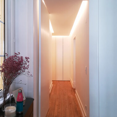 Remodelação integral de um apartamento em Campo de Ourique tendo como principal objectivo o aumento da área social e a inclusão de mais uma casa de banho no quarto principal.